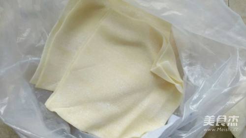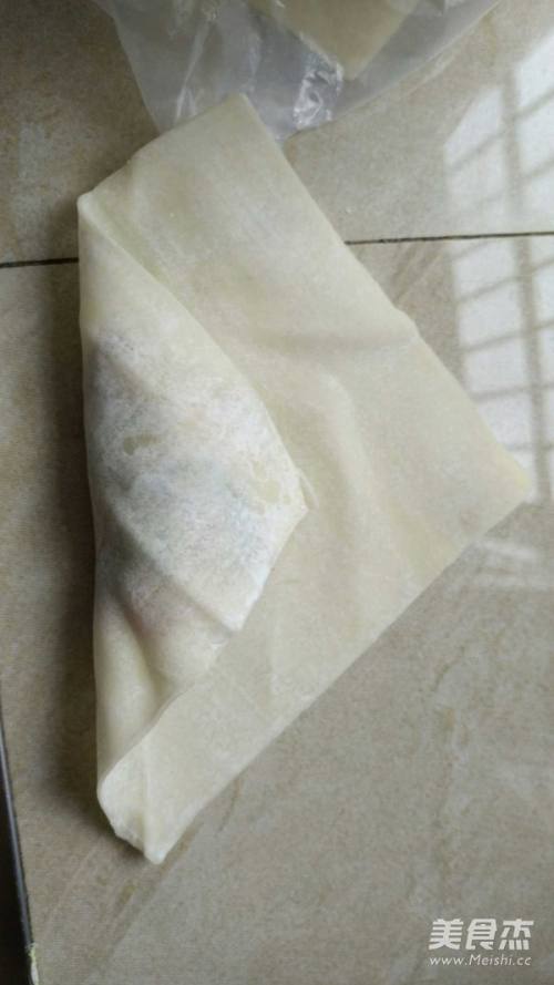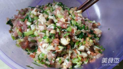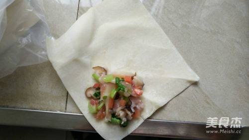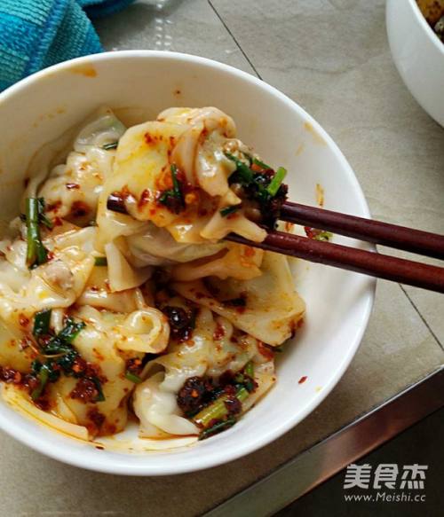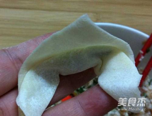 1拌好的混沌馅(白菜用开水过一下切末,胡萝卜切丁,香菇切丁用开水煮一下,葱切小段,放入鲜酱油、盐、胡椒粉一同拌匀)。