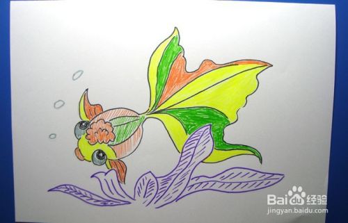 最后用黑色、灰色的水彩笔给金鱼的眼睛部分涂上颜色,如下图所示。这样一个美丽的小金鱼,就画好了。大家也来画画吧。