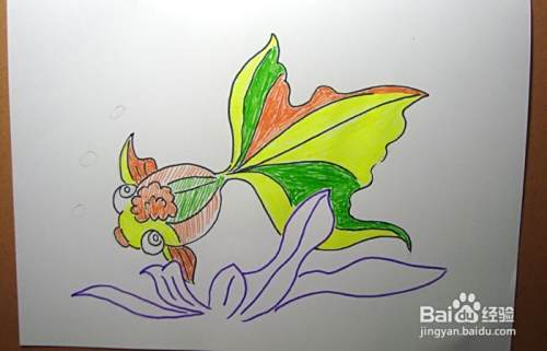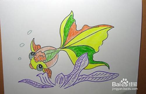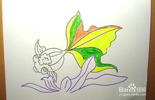 接着,用橙色、绿色、橘色的水彩笔给小金鱼的尾巴涂上颜色,要涂色均匀就好看些,如下图所示。