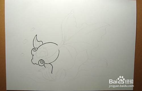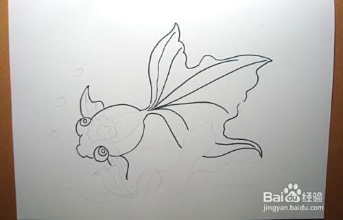 铅笔画个草稿布局,用黑色的水彩笔,先从美丽的小金鱼的头部开始画,把金鱼的眼睛和嘴一起画出来,如下图所示。