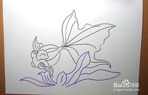 然后,用紫色的水彩笔画出美丽的小金鱼的背景,水草的部分出来,如下图所示。