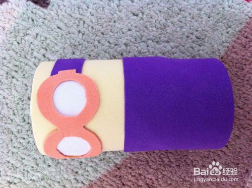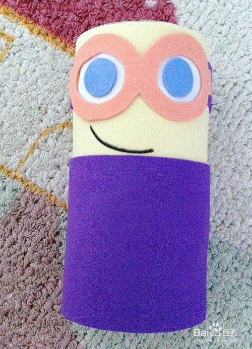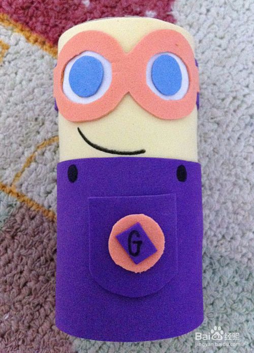 将裤兜粘在卷纸芯的紫色中心部位。用记号笔在裤兜中心写上“G”,并在裤兜左右上方个画上黑色圆圈装饰即可。