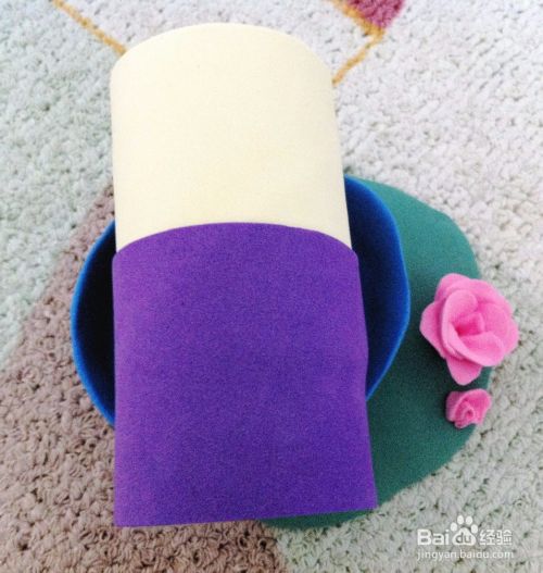 参照步骤1,裁剪紫色海绵纸粘在卷纸芯的另一端。