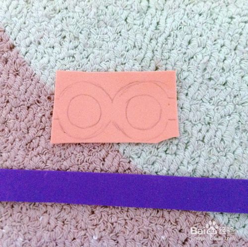 参照卷纸芯直径长度,取橙色长方形海绵纸,用笔画出圆形镜框轮廓。取一长条紫色海绵纸,作为镜架备用。