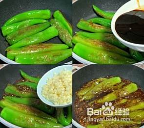 热锅热油加入青椒煸香至虎皮的样子,加入酱汁调味,加入蒜末炒均匀