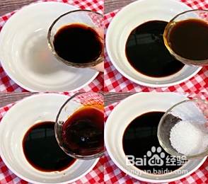 先把酱汁调好:取生抽2勺、老抽1勺、蚝油1勺、陈醋2勺、盐、白糖1勺放入碗中搅一搅
