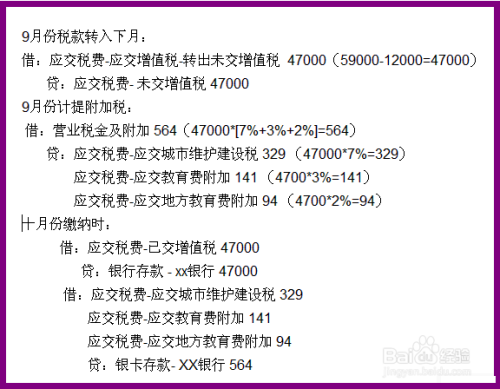 企业缴纳税款是每月1至15,即9月的税款10月份缴纳,那么9月份就要先计提,增值税就要先转入下月,等下月做账时再做支付的帐,例如:XX企业9月份发生进项税额12000元,销项税额59000元,假如城市维护建设税为7%,教育费附加为3%,地方教育费附加为2%,税款用银卡存款支付: