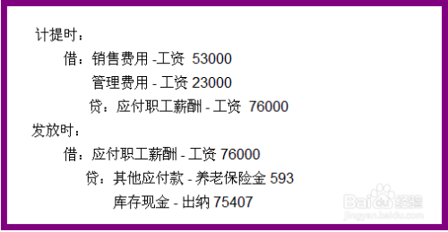 给职工发的工资要先计提,在发放。例如,xx公司10月份给销售人员发放53000元工资,给管理人员发放23000元工资,用现金发放,其中含职工养老保险593元,那么分录如图: