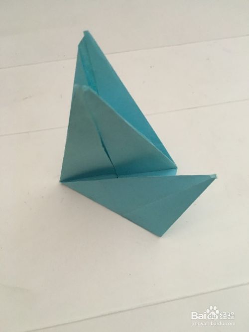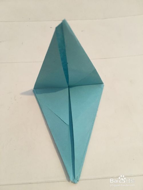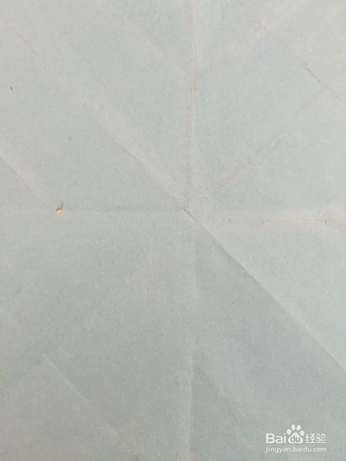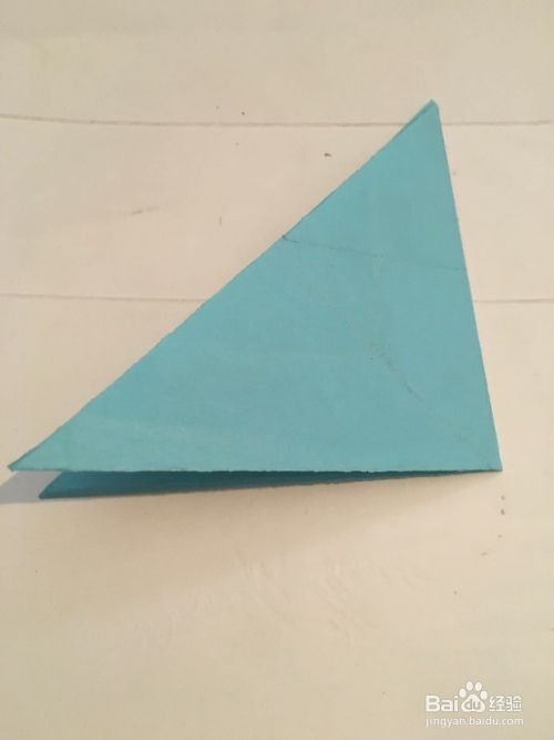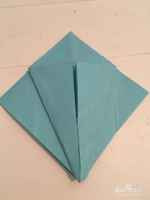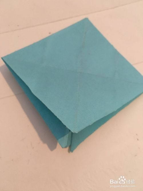 第一步 把一张14厘米X14厘米的蓝色彩纸 先从下向上折叠 再从右向左折叠 最后再对角折叠