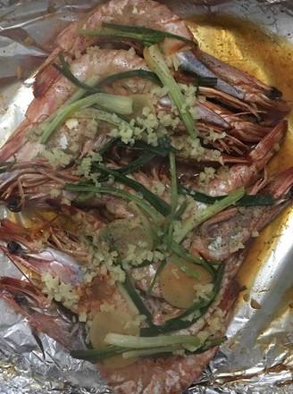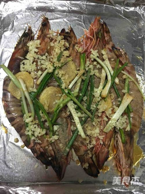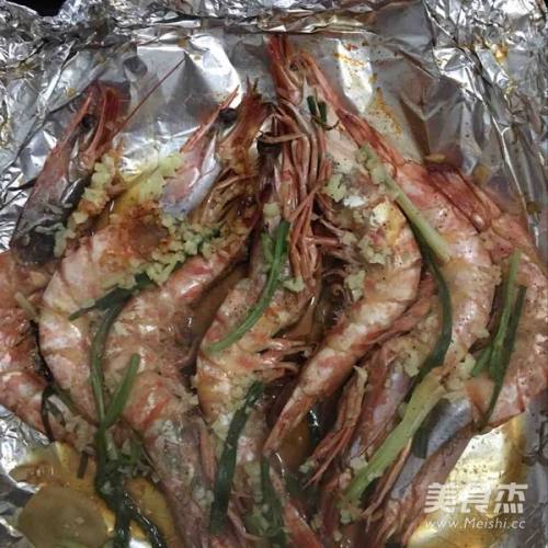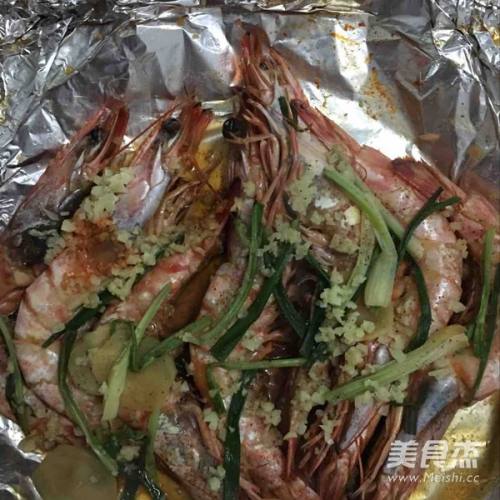 3烤盘上铺上锡纸,将虾和葱姜移入,多余的调料弃之,再撒上蒜蓉和胡椒粉,然后用锡纸将虾包起来放入烤箱