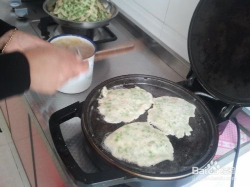 电饼铛预热,加油,把调好的糊状摊在锅里