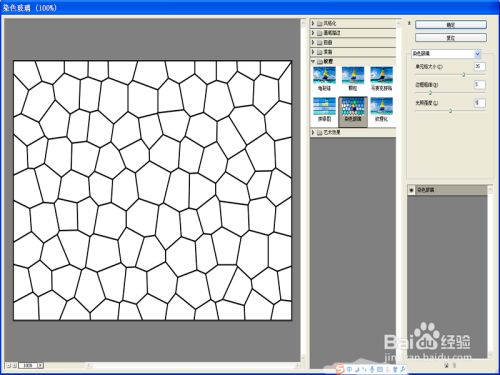 新建图层1,按ctrl+delete组合键填充白色,执行滤镜-纹理-染色玻璃命令,在弹出的对话框中设置单元格大小35,边框粗细5,光照强度为5,点击确定按钮。