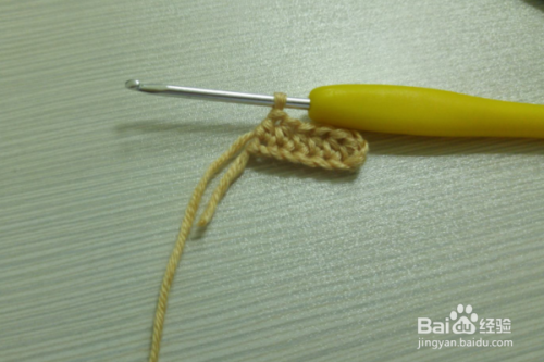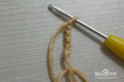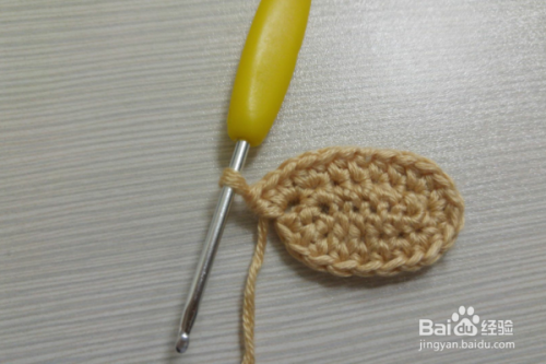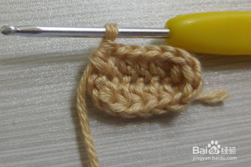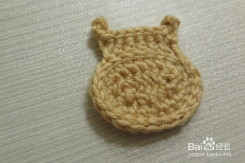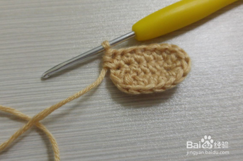 5行:翻过来进行钩织,立一个辫子针,然后在立的针目里引拔连接,依次钩织引拔针连接,然后再拉3个辫子针,返回在第一针里做引拔针连接,依次再钩织一行的引拔针,然后再拉3个辫子针,返回在第一针里做引拔针连接,这样几个牛面就钩织好了。