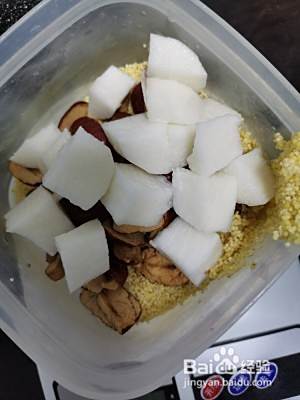 红枣去核,山药去皮切块和小米一起放进搅拌机打成泥,多打一会,很细腻山药水分多少会影响泥的状态,稠一点稀一点都可以,太稀就加点面粉山药可多可少,不要太精确