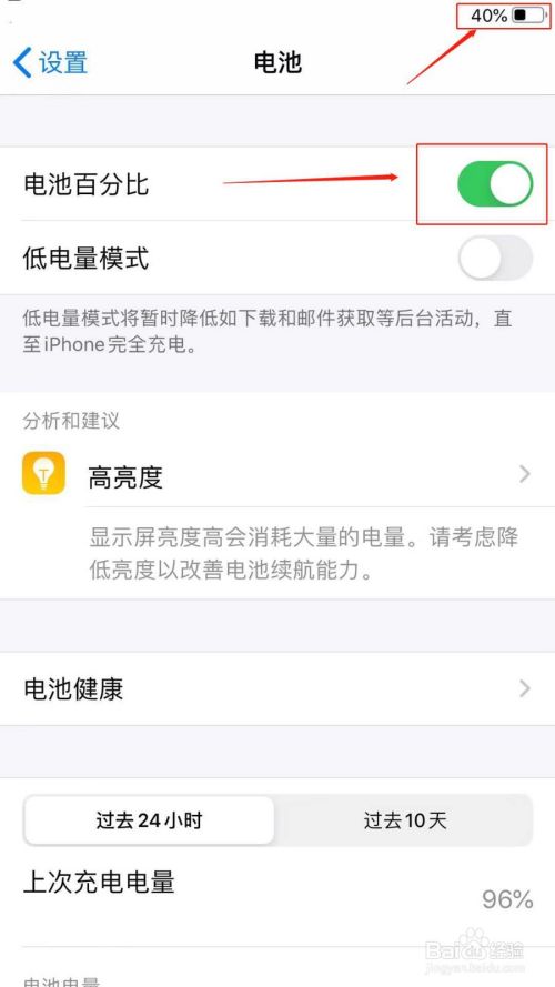 进入到电池选项中后,我们点击“电池百分比”右边的小圆钮,这时我们就会看到电池图标左边出现了电量百分比。