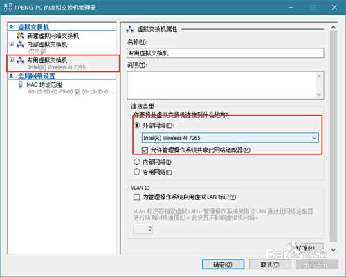 在连接类型中外部网络,从下拉列表中选择主机所使用的网卡,本实例中为无线网卡。