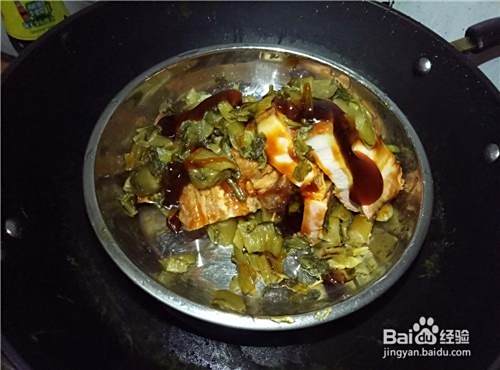 冷水上锅蒸,扣肉上再倒入适量的蚝油。