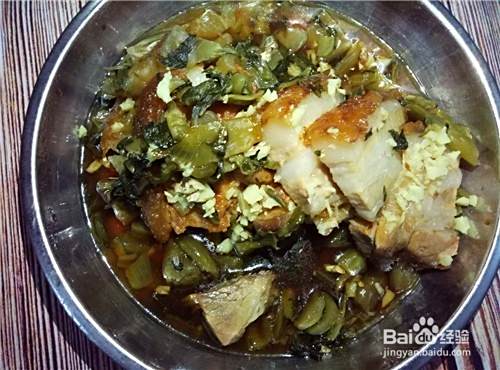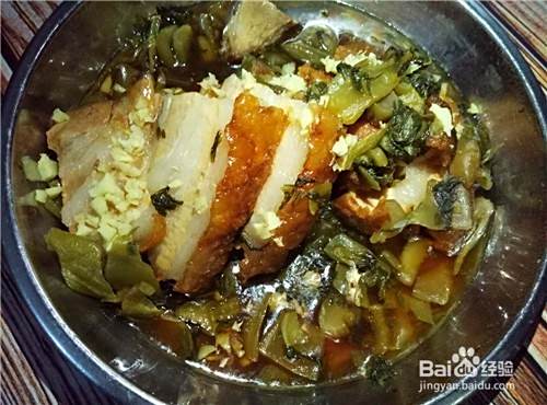 出锅后撒上适量的蒜蓉,即可享受美味的酸菜扣肉啦。