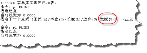 “指定下一个点或 [圆弧(A)/半宽(H)/长度(L)/放弃(U)/宽度(W)]”,输入W空格,指定线宽。