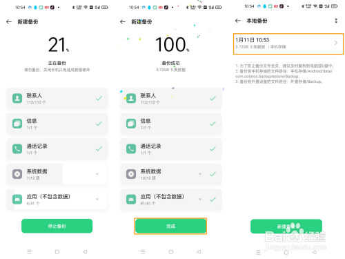 手机会提示:正在备份。备份成功后,点击【完成】,就会看到本地备份文件。本次备份存储在手机存储中,当双清刷机或抹掉所有内容与设置到出厂状态时会清除备份数据,请在操作前将备份文件拷贝到外置存储或电脑等设备中。