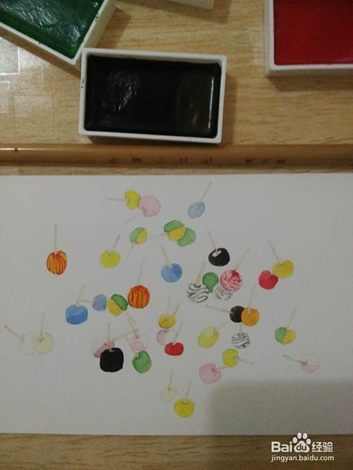 用紫色调墨,调成深紫色,画出一些棒棒糖的颜色,这个颜色可以自由组合,基本上都是平涂的方法晕染每个棒棒糖