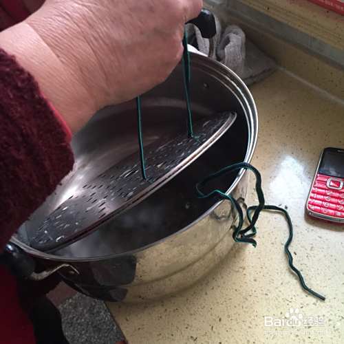 锅里放上水,别太多,富裕出水开的地方,找两个绳子拴在箅子上,这样防止年糕蒸熟就可以拎出来方便。