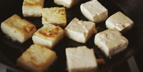 嫩豆腐,小心翼翼的从盒中取出,然后切成2.5cm的方块,厚度在1cm以内。用厨房纸轻轻按压吸掉豆腐表面水分,这样裹淀粉会容易些不会糊成一团。