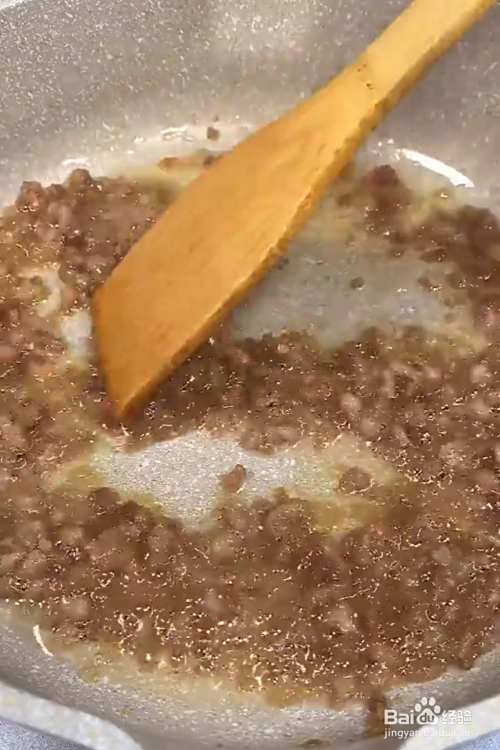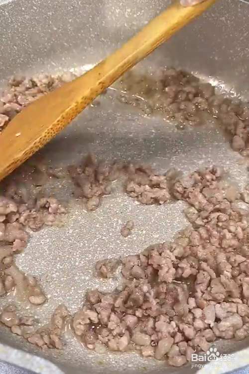 热锅下油,放肉末进去,加适量的盐、生抽、料酒爆炒至变色,熄火。