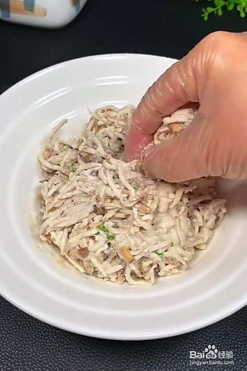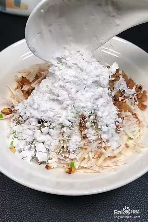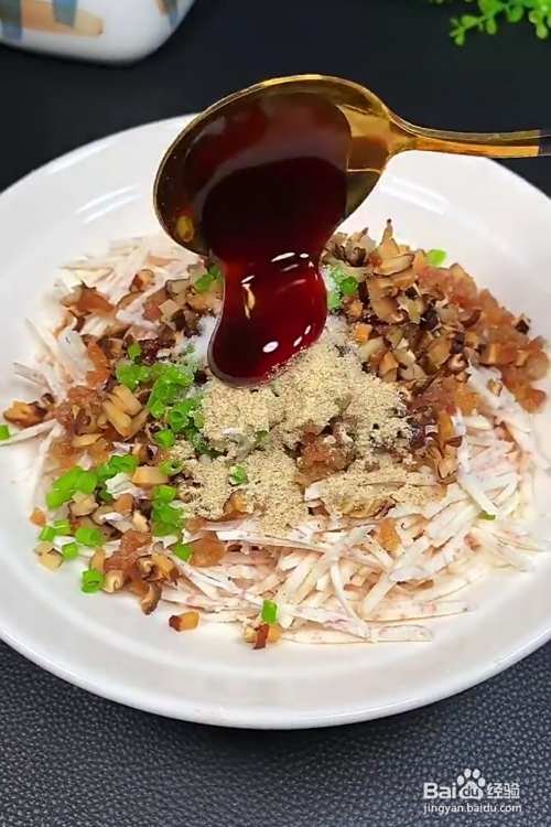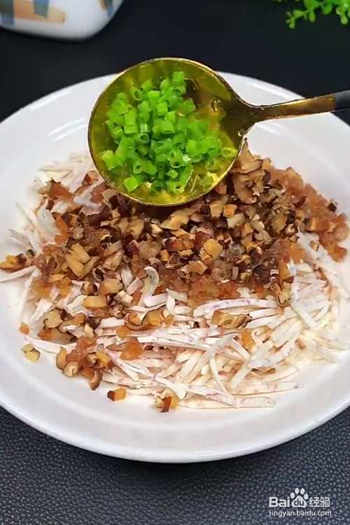 铲上香芋丝里,然后加50克的香菇丁、葱花、胡椒粉、蚝油。