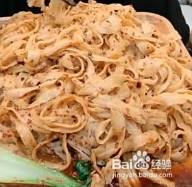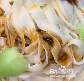 把调好的料汁,倒入面条中,放辣椒面、花椒粉,锅中烧油,把热油浇在面条上,拌匀即可