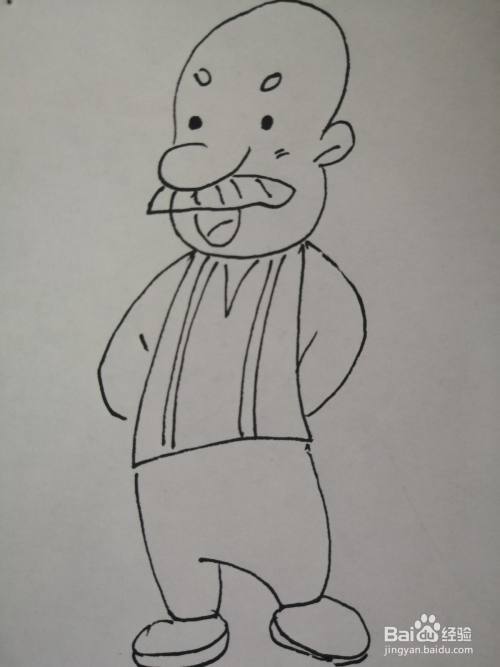 第八步,最后把简笔画老爷爷裤子下面的两只鞋子画出来。简笔画老爷爷就画好了。