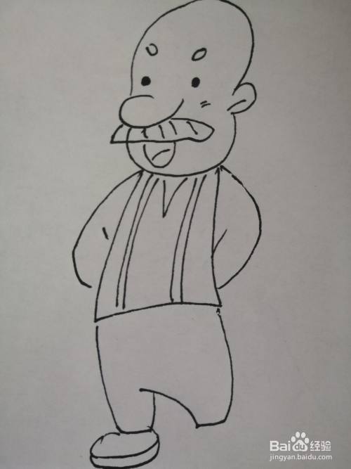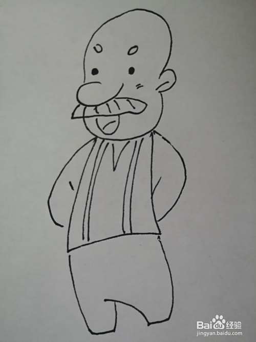 第五步,接着在简笔画老爷爷的头部下面画出身体和身上的两条背带。