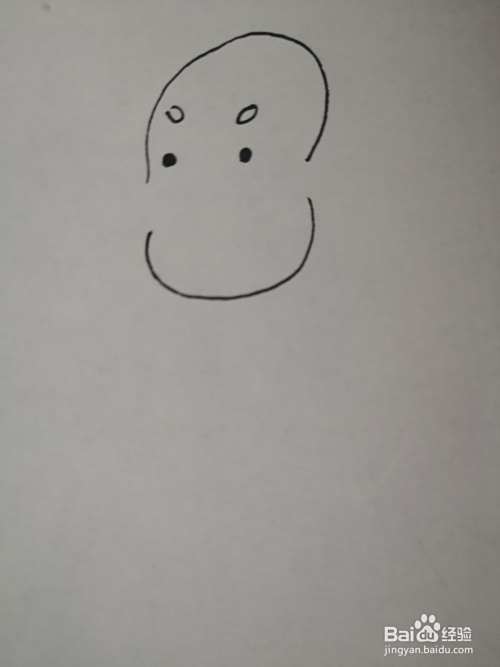第一步,我们先把简笔画慈祥的老爷爷的头画出来,在头部里面画出弯弯的眉毛和黑色大眼睛。