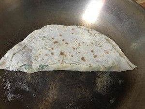 翻面后立起来把边烙一下出锅,切成两半,即可。营养又美味