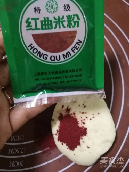 7这一小块面团加入红曲粉揉匀,变成一个粉红色面团,我们要用这个面团做猪鼻子和猪耳朵