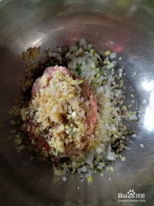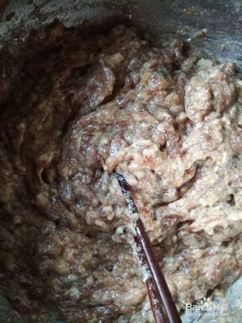 1, 将葱姜切碎,把各种调料放入肉馅中,搅拌均匀。