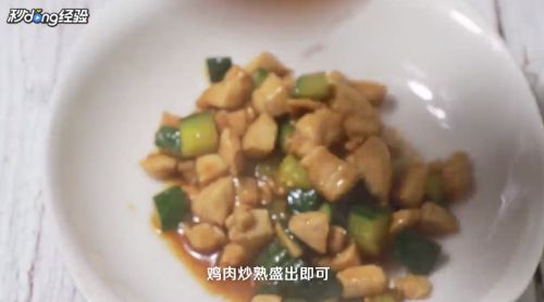 2锅中放油,加入鸡胸脯肉丁,大酱、黄瓜丁、糖、盐翻炒。