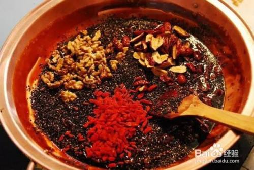 挂旗后加入加入红枣、桂圆肉、核桃肉以及黑芝麻,不停地搅动拌匀,防止粘着锅底。