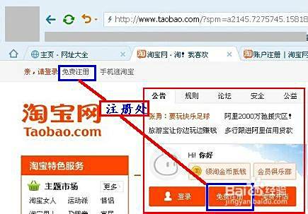 首先进入淘宝首页,如下图框,点击“免费注册”;