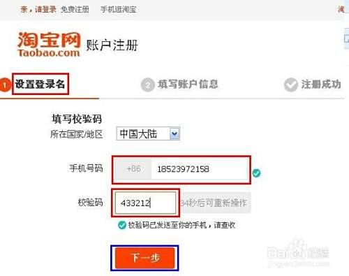 输入注册接收验证码的手机号码,如下图,填写验证码,点击“下一步”;
