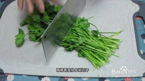 直接切掉所有香菜的根部,再将香菜从中间切开,均匀分成两半。