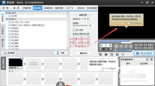 5以上就是如何添加图片的方法了。现在我为大家说一下,怎么为图片添加特效。添加图片后,点击图片,这时候左上角那一栏会跳到“叠加素材”