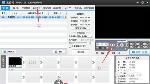 首先我们要打开爱剪辑软件在双击右下角的视频来添加一定时间的黑幕视频,这个在你编辑你的视频的时候,可加可不加,现在我只是做一个示范,首先我们看到右上角的视频栏那里,有一个三角形的按钮,代表暂停,我们按一下暂停按钮。
