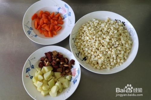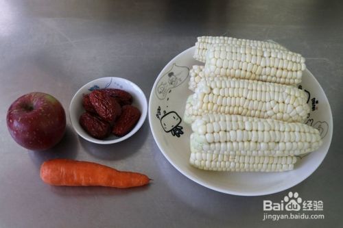 准备鲜玉米(选择购买糯玉米,糯玉米本身具有粘性),苹果,大枣和胡萝卜。
