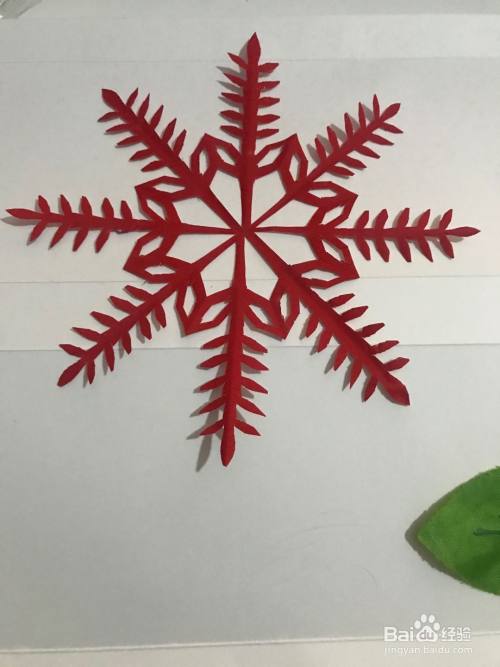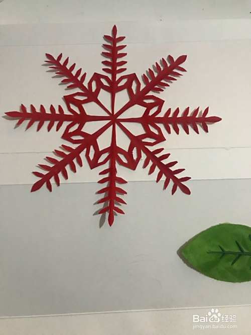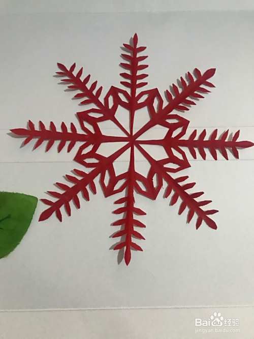 第六步 剪完外围多余的彩纸之后 再剪里面的镂空部分 剪完镂空部分再剪修边部分和其它涂实的部分等等 全部剪完之后展开铺平 一副漂亮的槐叶纹样团花图案就裁剪完成了