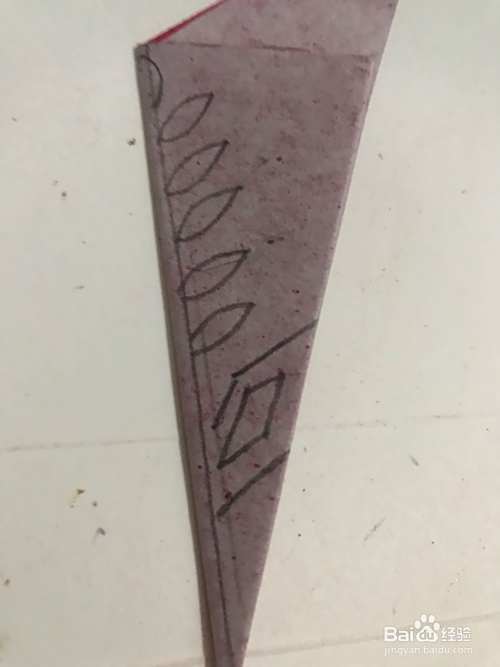 第四步 小空白三角向下折好之后 从折痕下开始画图 用绘图铅笔画上槐树叶子的叶片和下面其它的装饰小图案