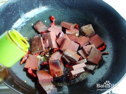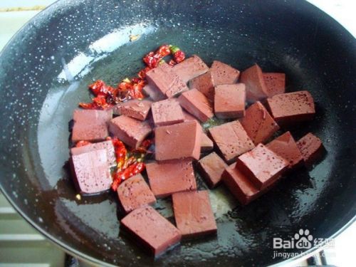 黄心菜洗净切段,姜切片、辣皮子洗净泡泡,血块洗洗切块