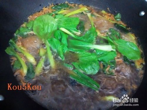 之后,把准备的青菜导入锅内,翻炒;之后,把锅内倒入适量的水,加热。