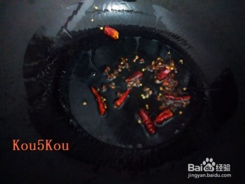 之后,打开炉灶,锅内倒入少许的油,加热;然后,把准备的花椒和辣椒放入锅内。油煎之后,把花椒和辣椒捞出来。