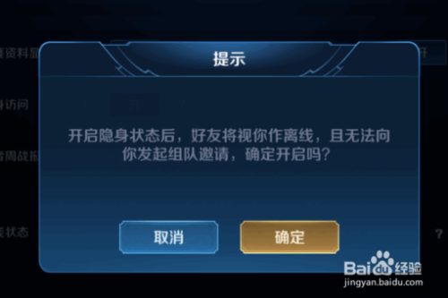 4、点击“隐身”后,开启隐身状态后,好友将看不见角色的在线状态,也无法发起组队邀请,点击下方确定即可。